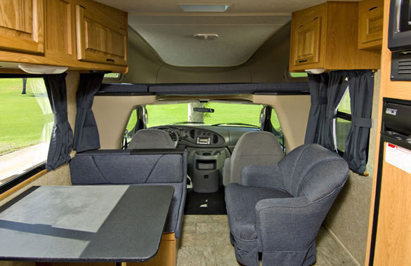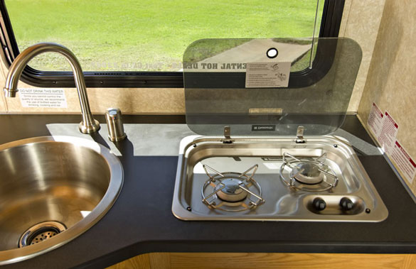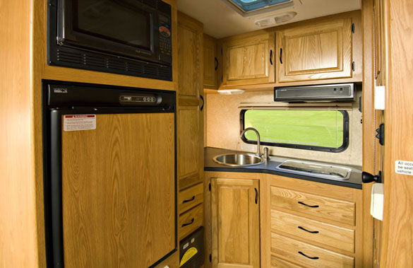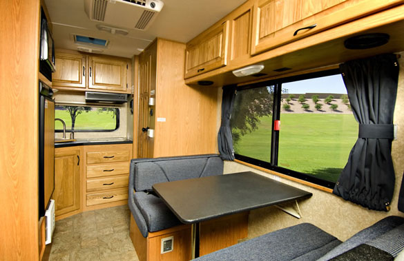 The floorplan features a unique rear kitchen design with all the amenities of a larger unit. The cabover bed is extra roomy making the compact RV the ideal unit for two adults of any age and a dinette folding to an extra bed allows for kids too. With six foot six inch ceilings and walk through convenience even tall campers can enjoy the compact RV.